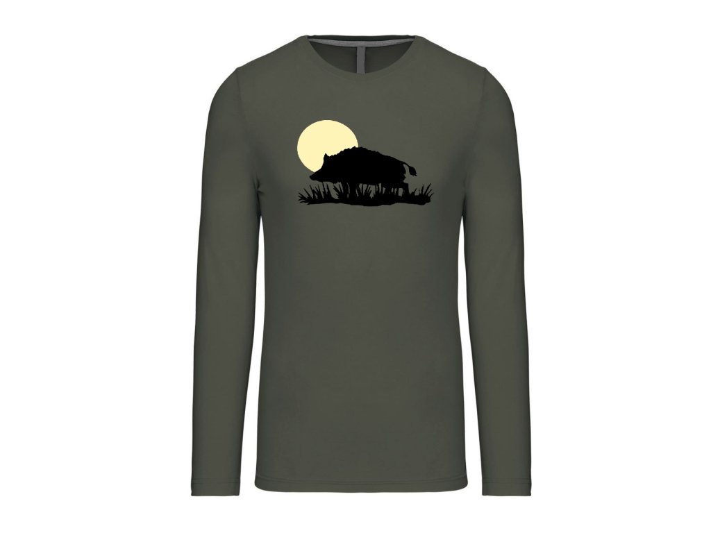 Myslivecké Tričko Divočák v měsíci dlouhý rukáv – Ideální volba pro každého myslivce, se zaměřením na komfort a odolnost.