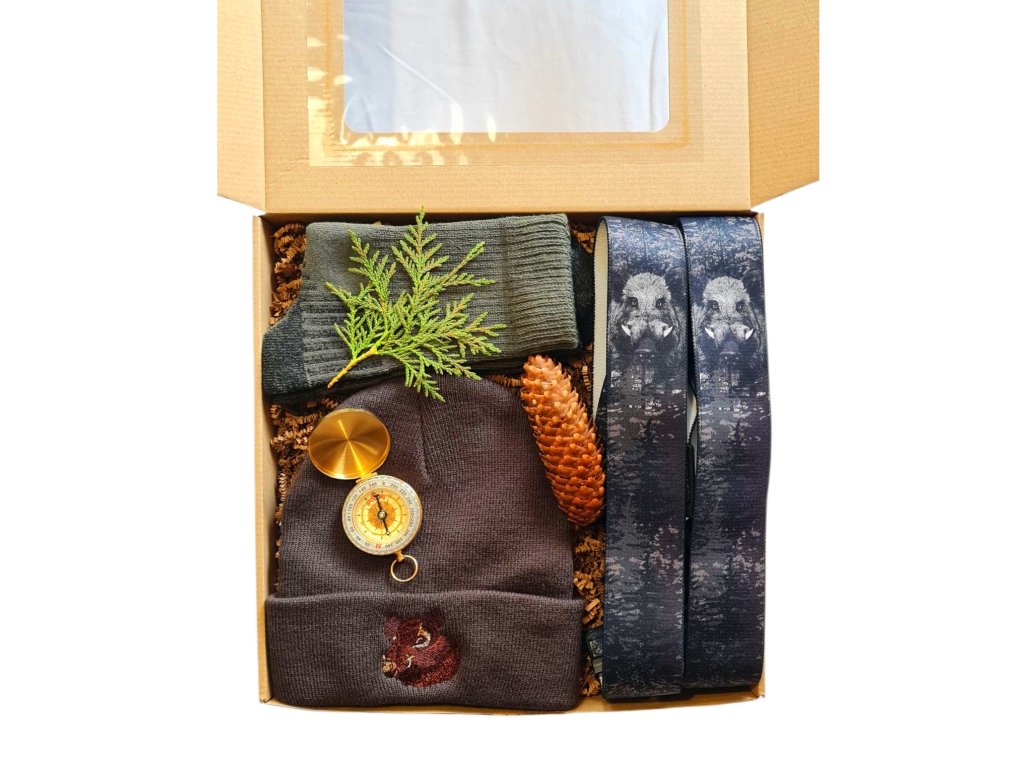 Myslivecký dárkový set - Čepice Divočák + Ponožky Les a Lov + Kšandy + Kompas – Kvalitní vybavení pro myslivost, který nabízí pohodlí a funkčnost.