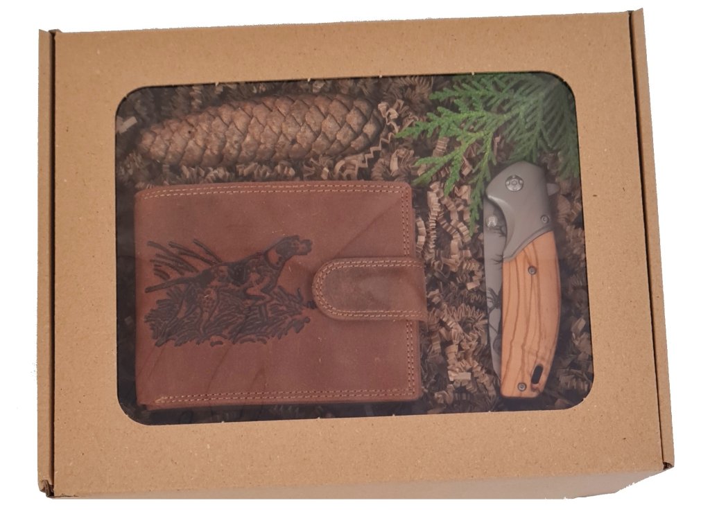 Myslivecký dárkový set - Kožená peněženka a lovecký nůž – Spolehlivý pomocník do lesa, pro lepší organizaci vybavení.